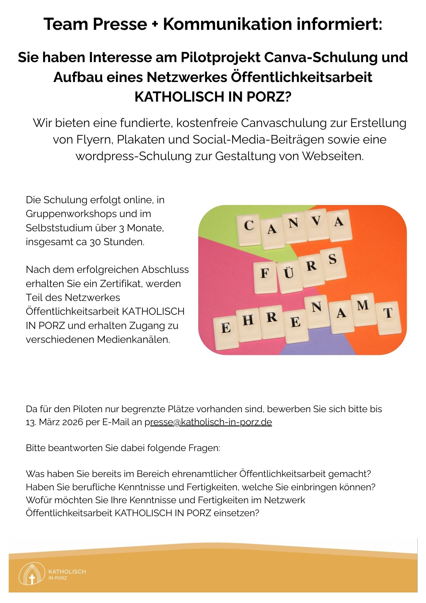 Da die Plätze im Pilotdurchgang begrenzt sind, wird um Bewerbung bis zum 13. März 2026 gebeten – per E-Mail an: presse@katholisch-in-porz.de.